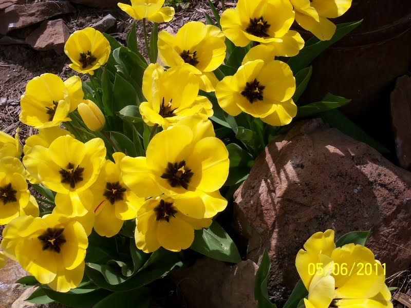 Friday morning Brad and I did yard work. It takes us about four hours to get through the three places. It was so nice yesterday ---- first time in the four mowing's that I did not have to wear a coat a scarf. We are really trying to simplify the yard so that we can handle things better. We added some more bark to the front and pulled out a couple of bushes. I will not miss them. We are not going to be planting any of the pots this year. With the plans that are in place for the summer we will be gone quite a bit and it is just too hard to have others water them. So ---- no flowers this year. We have been planting the garden though. Yesterday we found that three onions have come through and the peas are coming really good. We added corn, beans, and carrots yesterday. Next week we will add potatoes and beets and parsnips. Not a big garden space but great for us. After my birthday we will add the tender vegetables. My tulips are finally blooming (Kelsey can now celebrate her birthday --- HaHa).