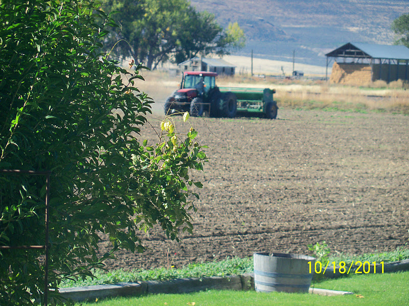 Today Brad is planting the fall grain. He does look a little strange driving a red tractor. He is using Lynn Hardy's drill and tractor to plant. We truly pray that we will again be blessed with a bounteous harvest next fall.